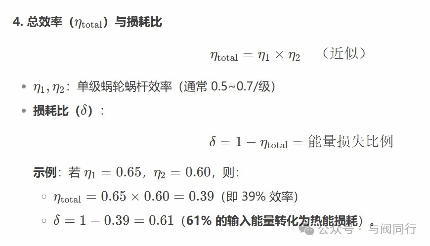 | 蜗杆摩擦损耗 | 65%~75% | 滑动摩擦主导,铜蜗轮表面刮擦(新机η≈0.6,磨损后↓0.4) |