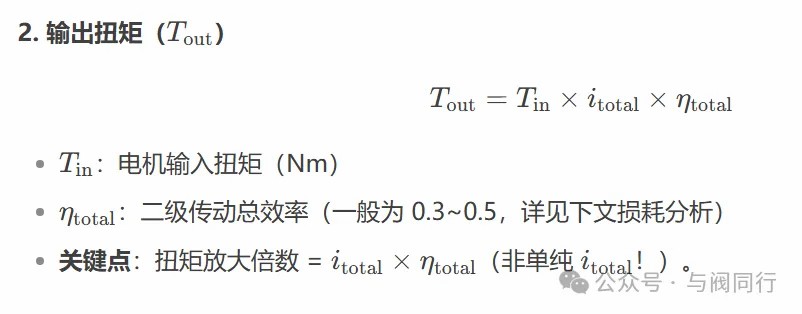 警告:计算扭矩必须按 η_total=0.3~0.4 选型,否则可能带不动负载!
