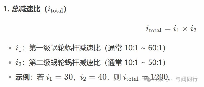 二级传动: 意味着有两套这样的蜗轮蜗杆副串联工作,以实现更大的总减速比。